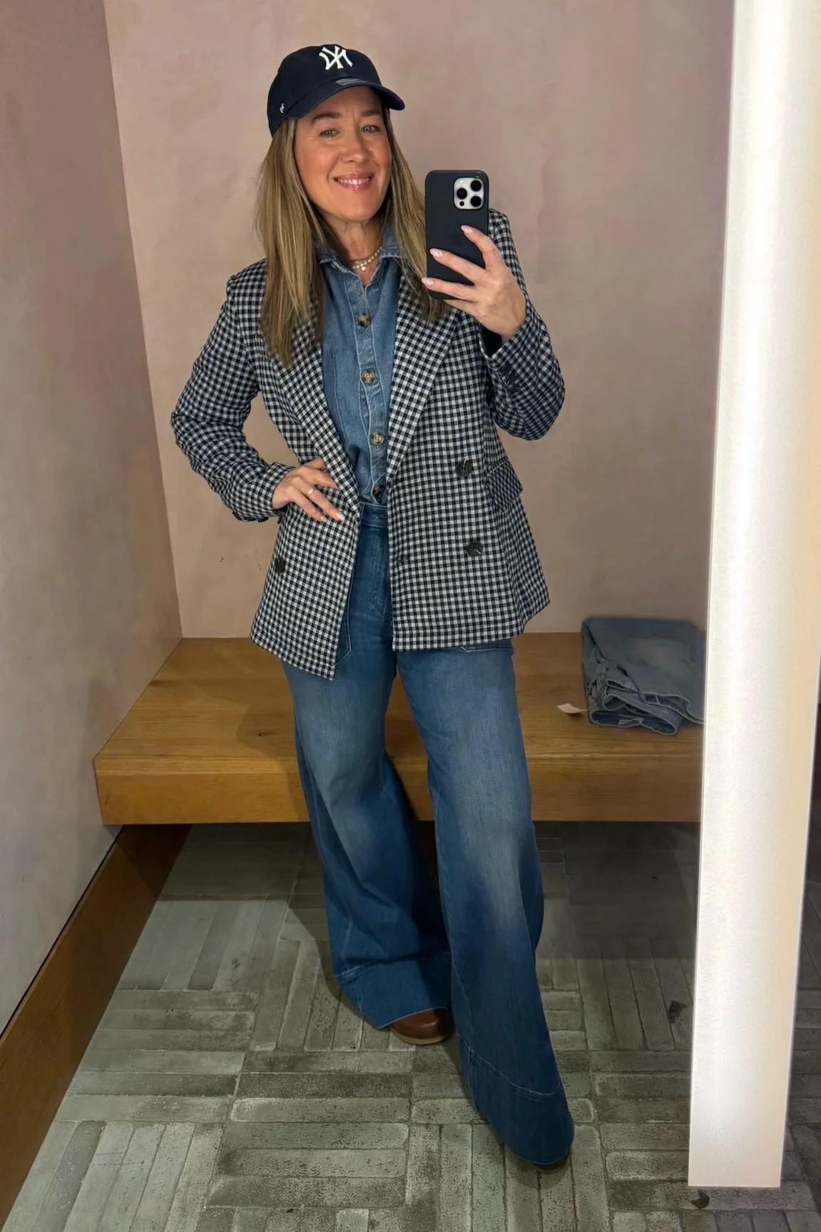 WHAT: Avec Les Filles Double-Breasted Knit Plaid Blazer* and The Rylan Relaxed High-Rise Flare Jeans by Pilcro*