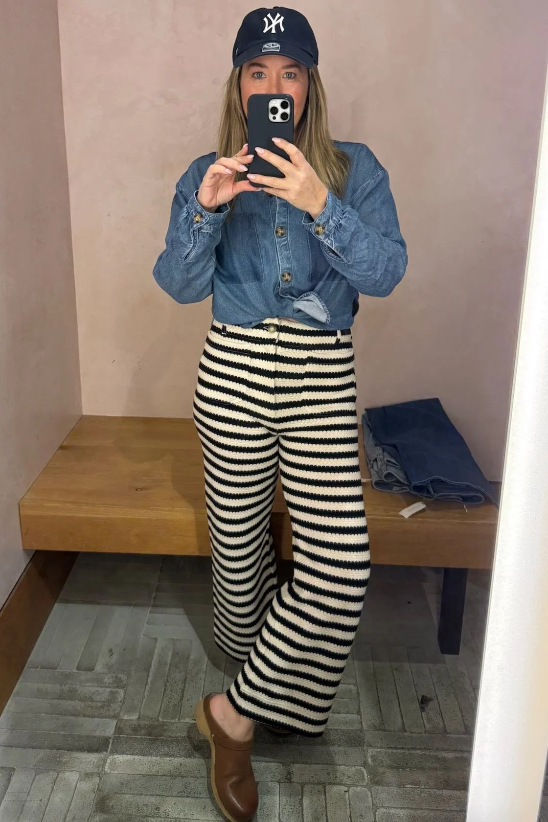 The shape and construction of these pants is unmatched. We write about them near daily like this and this and this—they just have a very specific way of holding in the tum while making the bum look pert. But this time … it’s in a stripe. And for the first time in a very long time, I don’t know my own feelings. I love stripes and we also write incessantly about stripes like THIS, and I know you’re thinking about the old adage of stripes making us look “wide” (thanks mom) but while I don’t think it actually makes me look wide, it might just be weird. Though the comfort is wild.