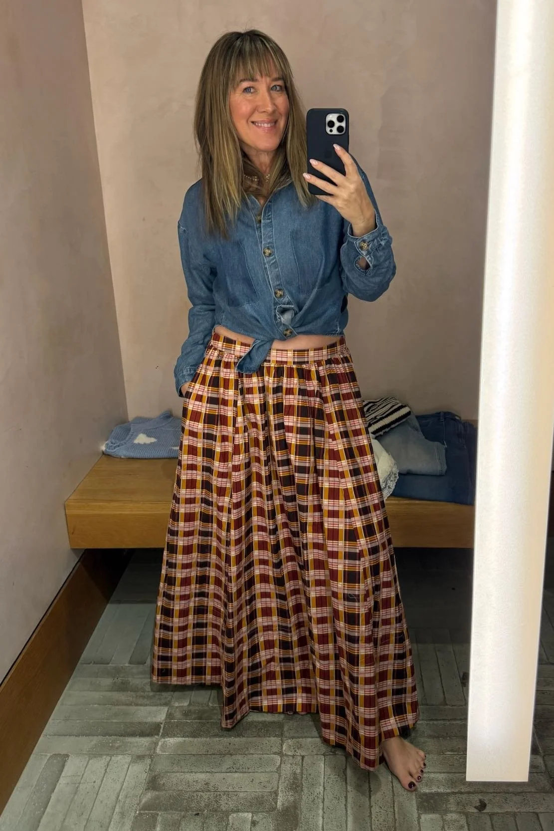 WHAT: The Jacie Printed Poplin Maxi Skirt by Maeve* and Cloth & Stone Shadow Pocket Denim Buttondown Shirt*