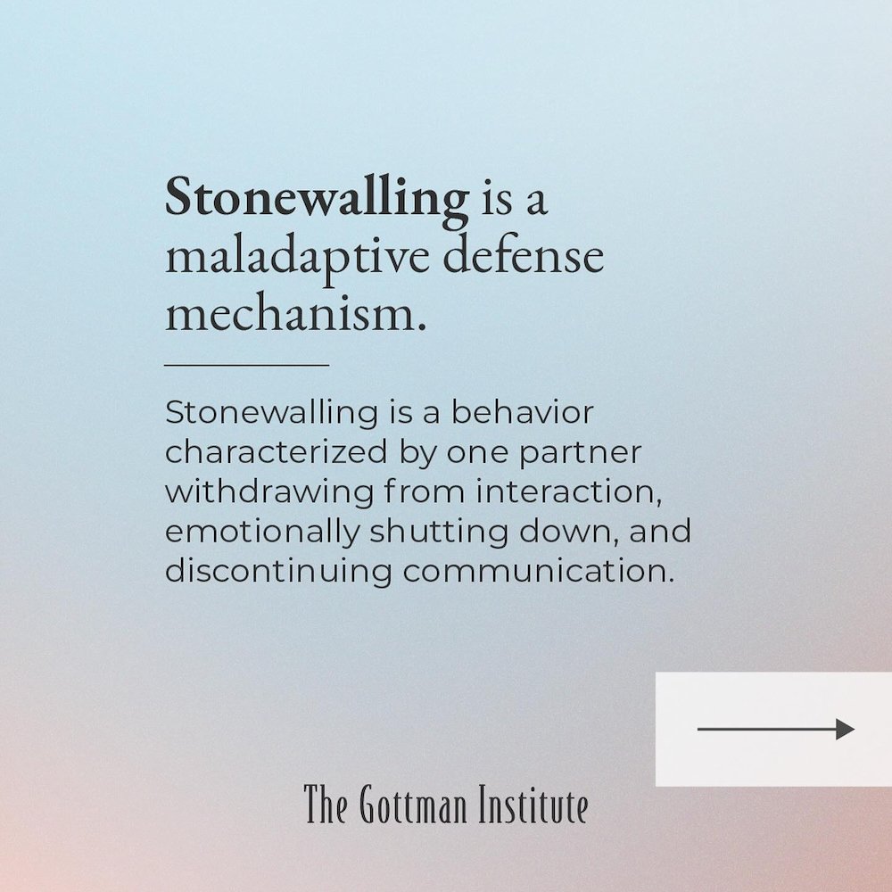 The trouble is this can lead us to another horseman - stonewalling. Stonewalling is a way of shutting down and coming to a complete standstill where nothing gets talked about or resolved.