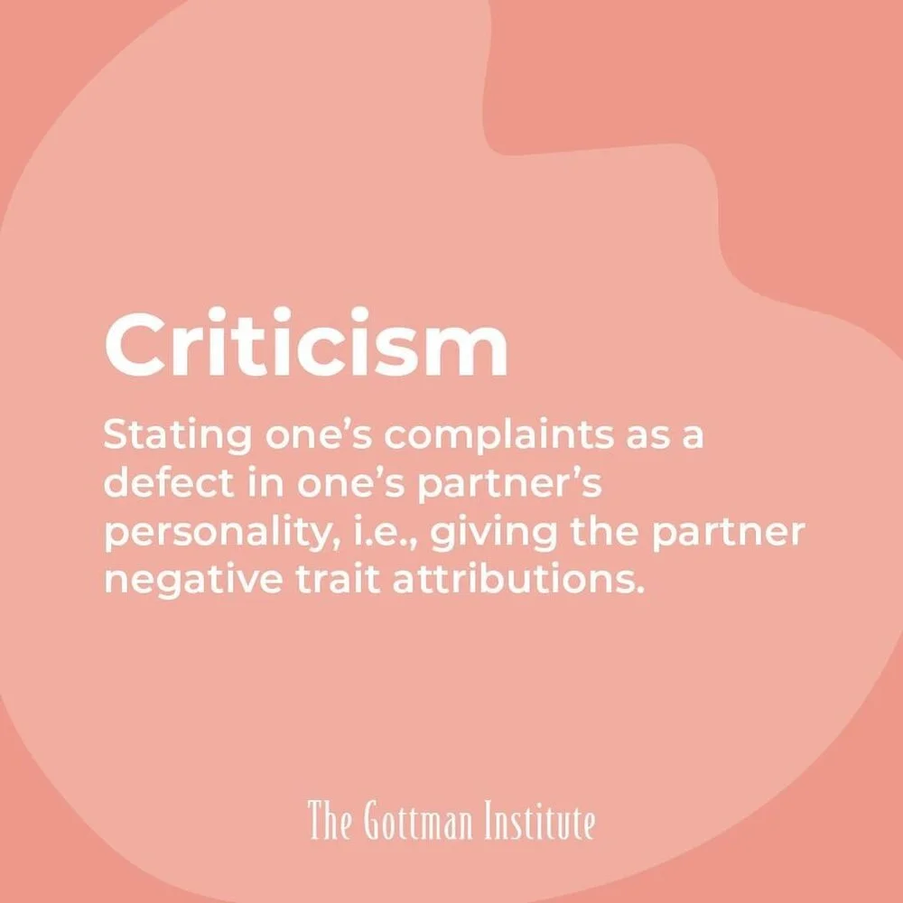 According to Gottman, there are four horsemen of the relationship apocalypse - that is, four specific patterns that increasingly predict a relationship’s demise. The first is criticism.