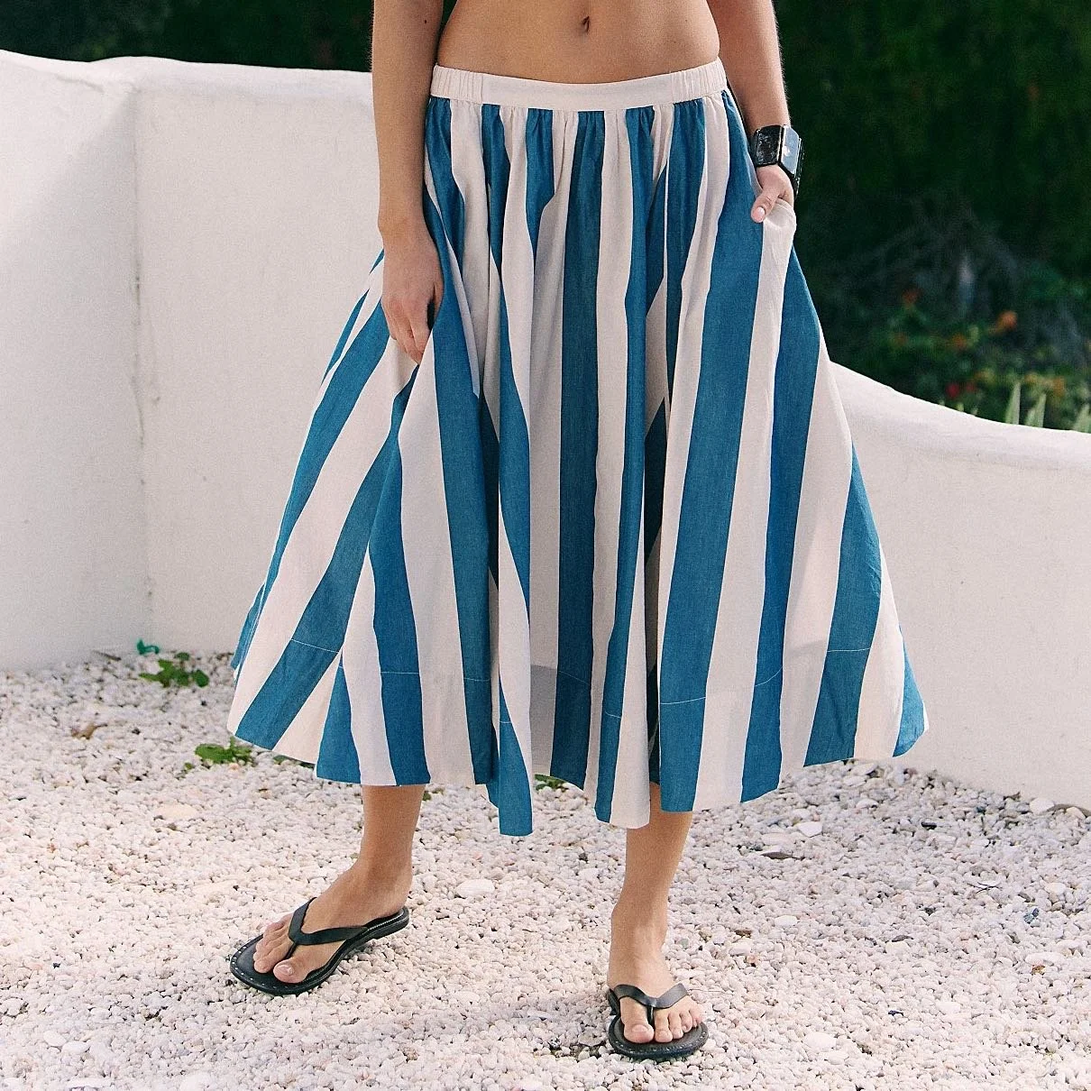 Why We Love It: We’ve written whole articles about this skirt. We own it in multiple colors. It’s the most welcome alternative to pants on warm days. Pair this skirt with any white t-shirt, tank, or button-down you already own and you look instantly upleveled and chic. There’s a band in the front so it looks elegant, but smocking in the back so there’s loads of stretch (the ultimate pairing). It comes in a bunch of solid colors, but you know how we feel about a stripe. We won’t make you sit through it again.