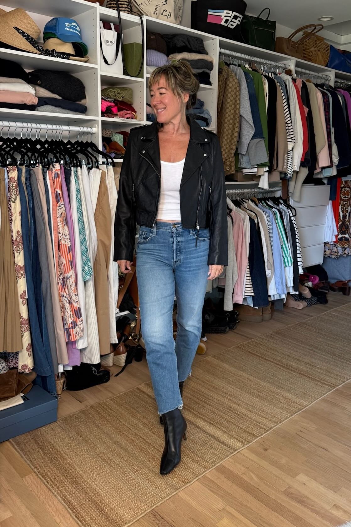 A leather jacket is possibly the most crucial piece of outwear when we don’t want to bury ourselves in bulky layers. It has that perfect cut that’s tailored to your shape, making it sexy without even showing a hint of skin. We like it looking leather-ish for Sandy from Grease vibes (along with every other “cool girl” icon in any movie in the past 5 decades).