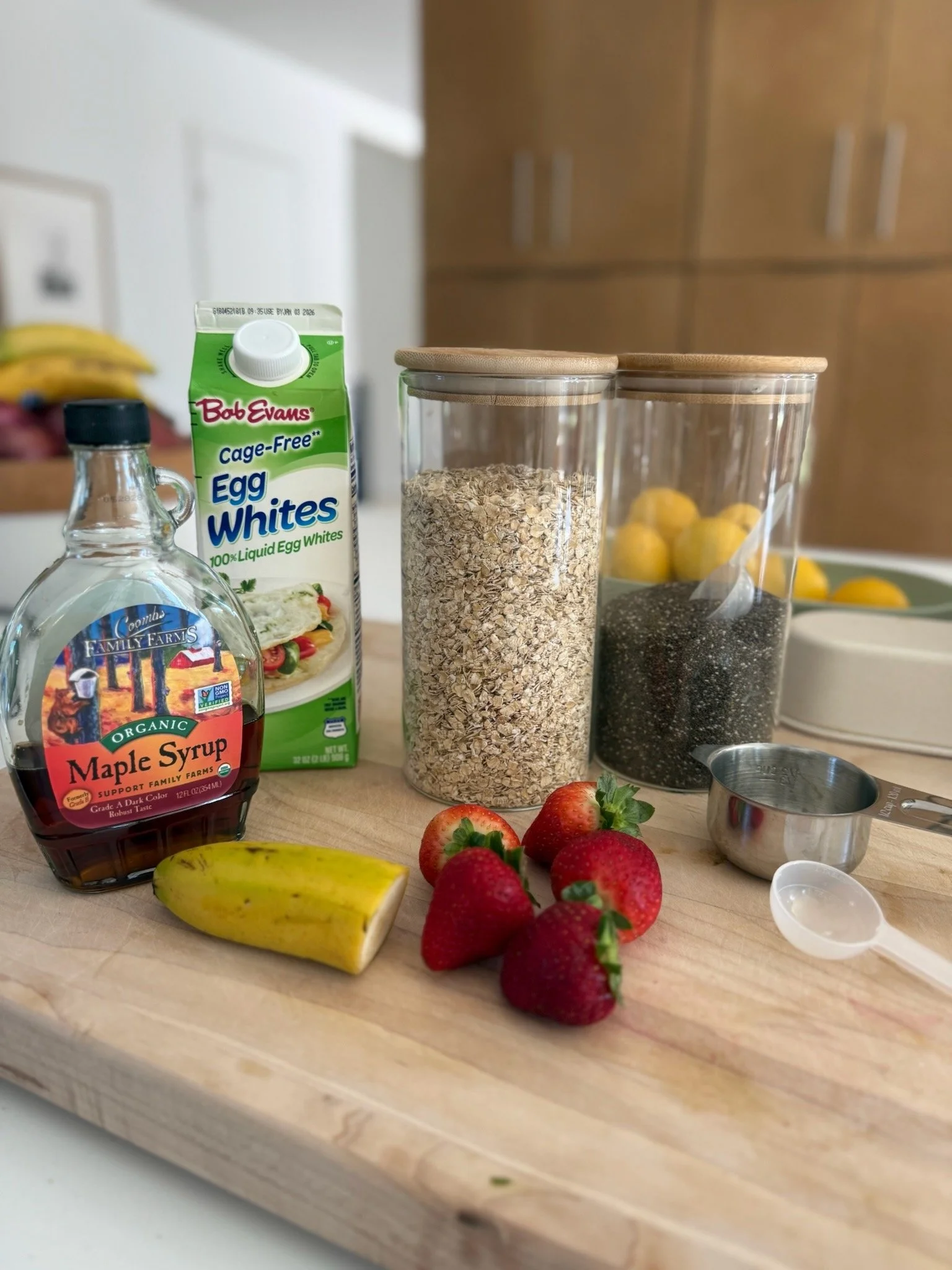 Stir a 1/2 cup of oatmeal, 1/2 cup of water, 1/2 cup of egg whites, and a tbsp of chia seeds into a bowl and micro for 1:30.