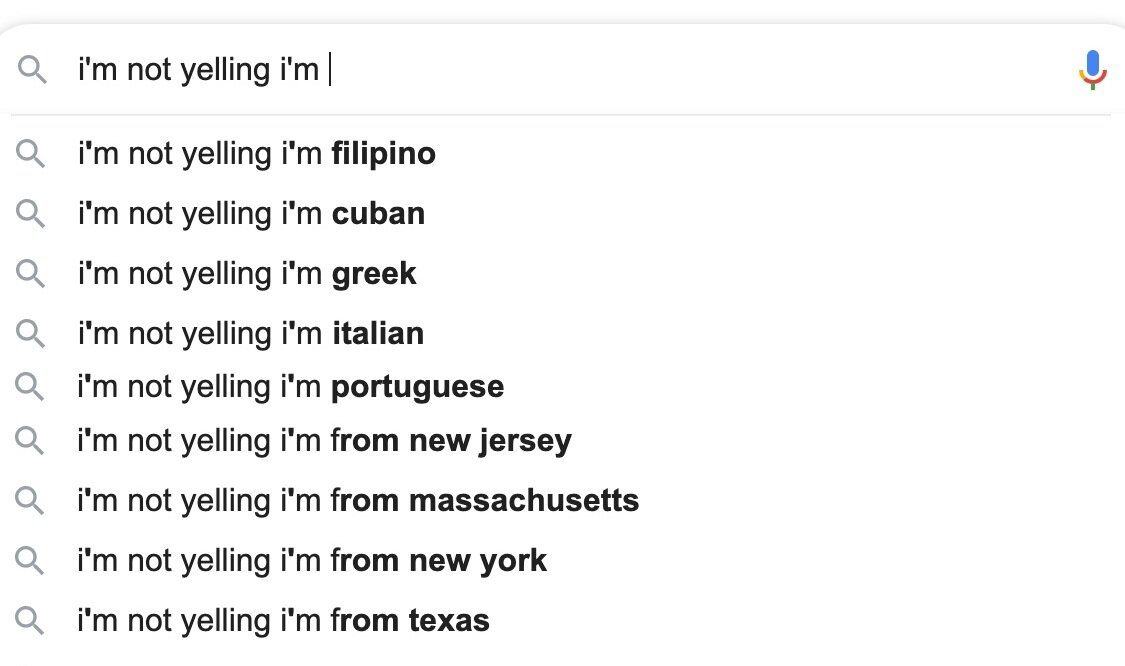 A cacophony of constant noise is still my normal. And I like it that way (except when I’m writing). I can look to my parents, two years shy of their 50th wedding anniversary—and our immediate family that is as tight as one can be—as a normal that lasts. Apparently, yelling is perceived as so common in our culture that the saying “I’m Not Yelling, I’m Filipino” and variations on it are available on all sorts of merchandise, as with other cultural groups if you just Google those first words. According to popular search terms, Italian, Polish, Italian, Greek, and Hispanic people and Texas, Wisconsin, and Chicago girls can relate.