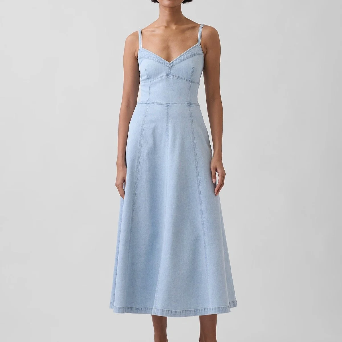 WHAT: Denim Seamed Corset Maxi Dress*