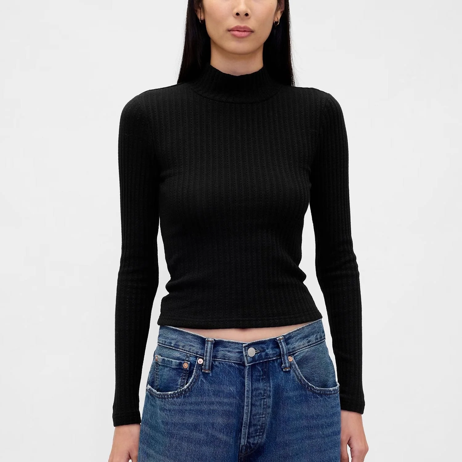 You can’t not look sleek and put together when wearing a fitted, black long-sleeve on top. Start with a well tailored cashmere pullover. It’s a classic girl’s best friend. This flawless one from Quince costs 3-4x less than anywhere else, which means we get to buy it in 2-3 colors beside black, no?