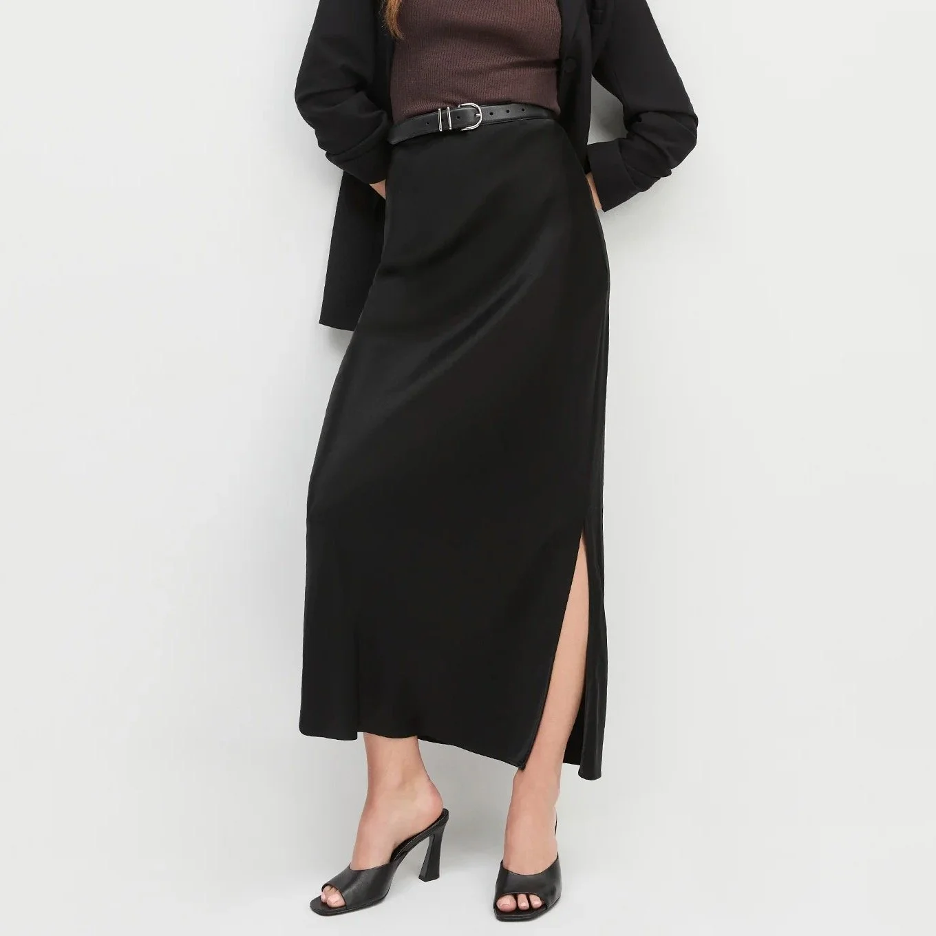 This might be the most classic, silky skirt we’ve mentioned, but what sets it apart is really the fit. It’s a a pull-on waist and a bias-cut, which means it drapes beautifully on our bodies and is very flattering. It’s not too tight but has those lanky, clean lines that are a trademark of the outfits in APM. Because it’s one of those lifetime pieces we talked about and not some $20 shiny skirt from Amazon we’ll give away in a year, it is more of a splurge, but we plan to keep it for life, so our cost-per-wear will be pennies in no time.