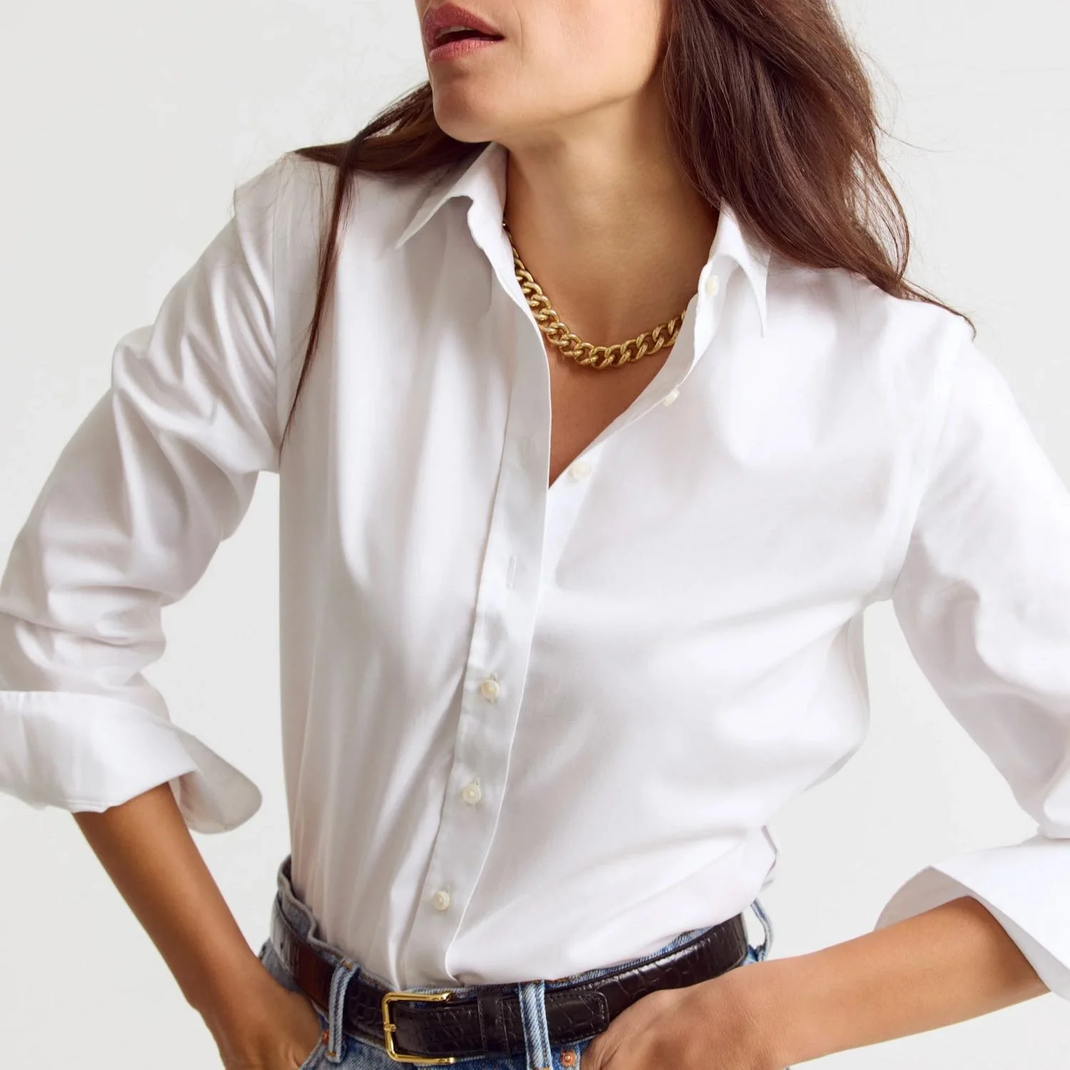 We could go on all day about the best white, button-down shirt (oops, we already did here). It is unequivocally the most useful item in our closet when we want to look Grace Kelly chic with zero effort. But we highlight this one because of its tailored fit and No Gape® button technology, so we only show skin where we want to.