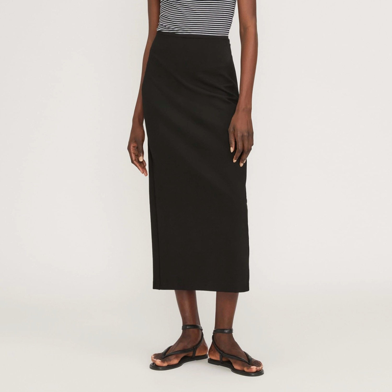 Why We Love It: Sensible” pencil skirts are actually an amazing hack for looking long and lithe and having our curves wildly complemented. This one is made from a magic sort of double-knit material that has lots of stretch but really hoists you in. The side zipper is invisible which adds to its smooth, sleek effect. Because it’s fitted, it also balances our looser tops and sweaters, making it a very useful staple that we layer over in fall and wear with a tucked tank in the summer.