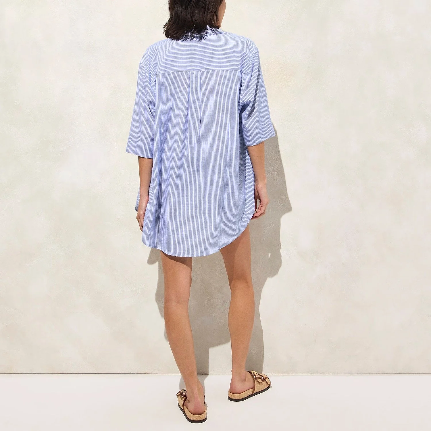 Why we love it: If you want something foolproof and quiet luxury, just get this gauzy button-down which is long enough to sit open over your full suit but not so long that it can still be tucked or tied over shorts and linen pants and worn to lunch. And yes, it does indeed cover the butt.