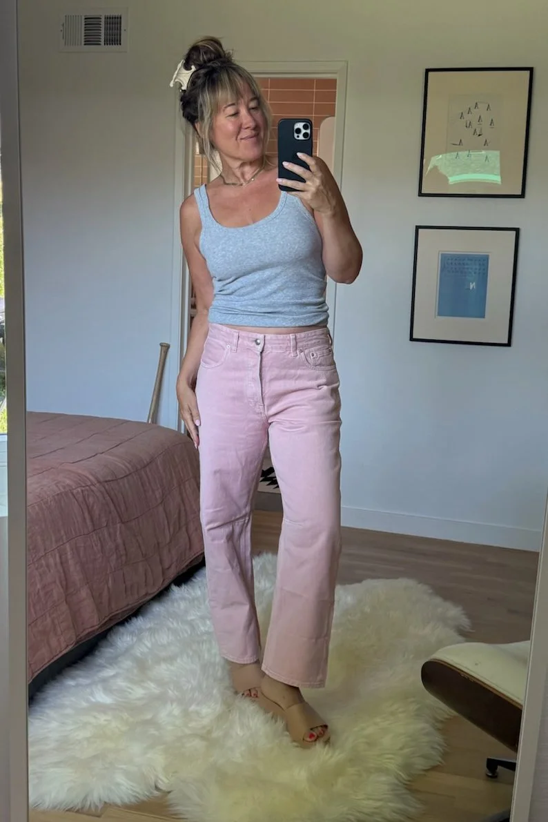 WHY IT WORKS: For starters, proportions. Pairing a flattering, fitted tank that sort of sculpts your upper body with looser fitting but still tailored denim like a barrel jean, makes us feel as comfy as if we were in soft, airy PJs, but we come off completely put together. The second trick is to create a little “color moment” as the fashion people say. These pink jeans from Madewell have us emitting a kind of glow and makes our sun-kissed cheek color really pop.