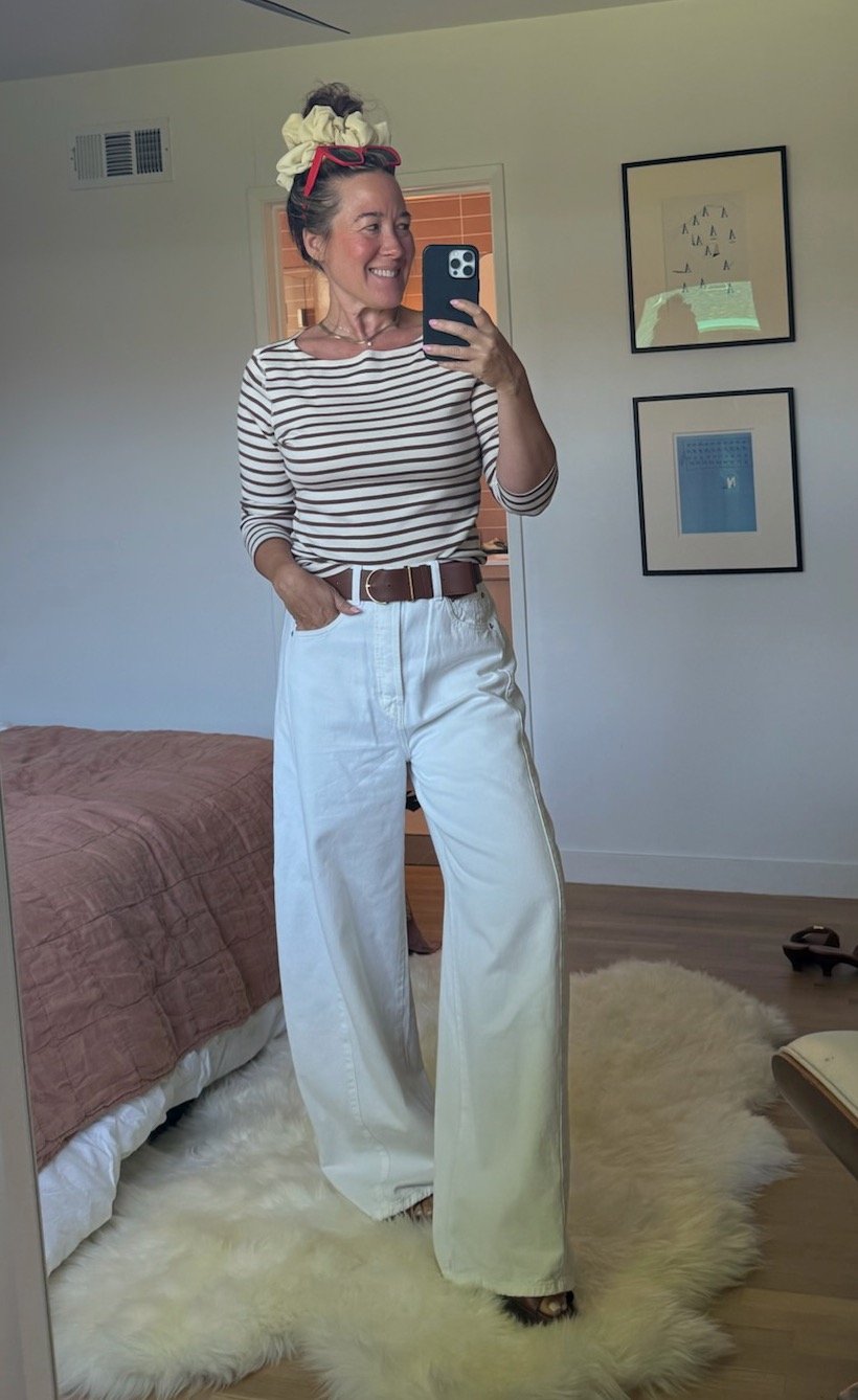 WHY IT WORKS: We talk all the time about the magic of the mariniére. It makes us sound fancy, but the truth is it’s just that classic, striped, boatneck tee you see all elegant French women wearing. The most classic version comes in white and blue (which we have), but we also like it in a warmer color in the warmer months. We wear it with a tan belt and white pants, which are not scary when they fit like this. It’s a look we can wear on weekends of to work, and it absolutely makes us feel like we know exactly what we’re doing where fashion is concerned. But we’re really just in wide-leg pants and a tee. So easy!
