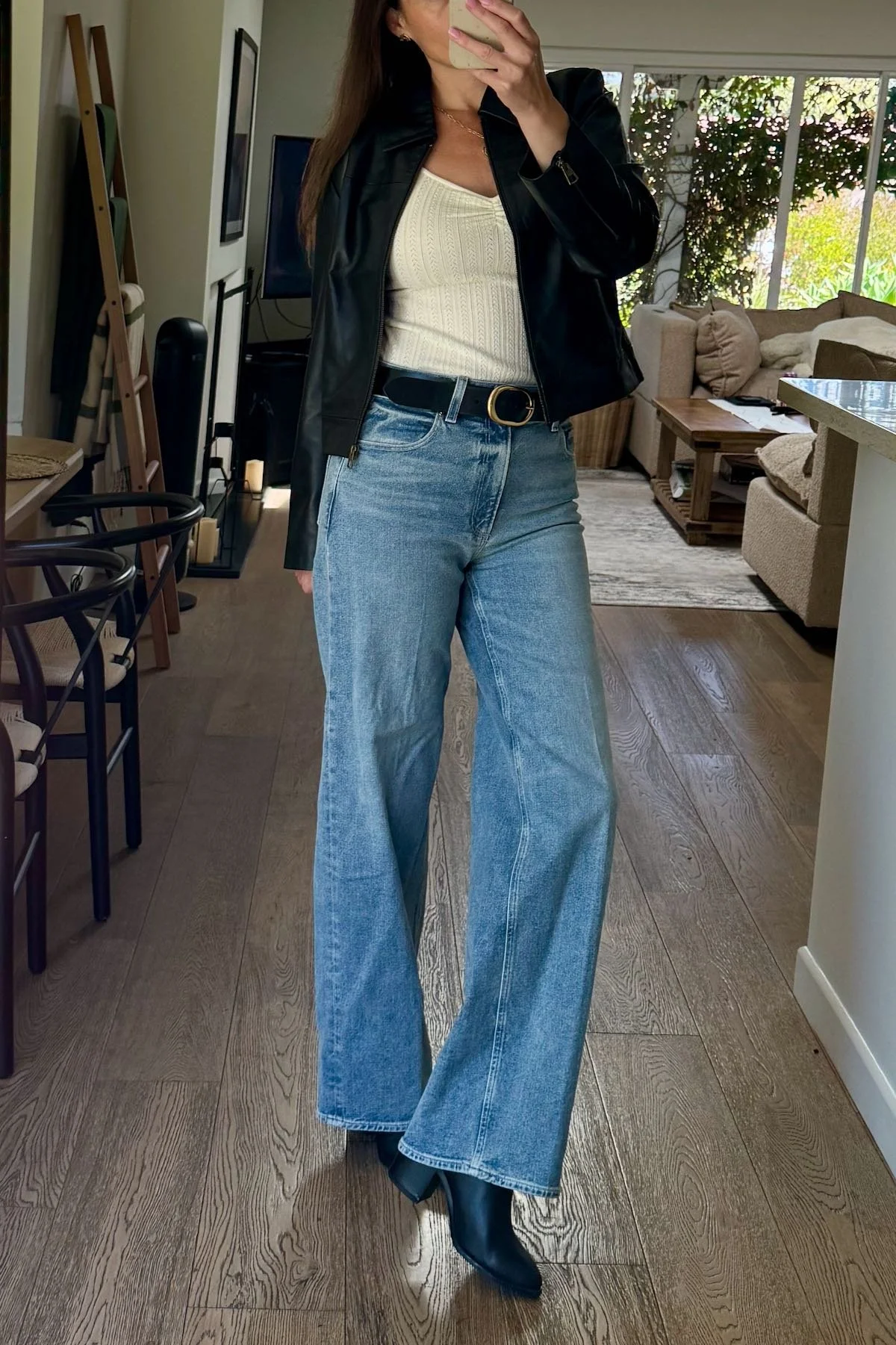 Right, so finding a genuine leather jacket with that classic, waist-nipping cut for $225 was already a win. But the real value of this one is that every time we grab it off the hook on our way out the door, we look like we spent actual time putting together our entire outfit. It gives us a great silhouette whether it’s over dresses or jeans or literal leggings. The leather is soft and luxurious and the crop is extremely flattering. It actually makes our legs look longer and gives more of a cooler, cleaner effect.