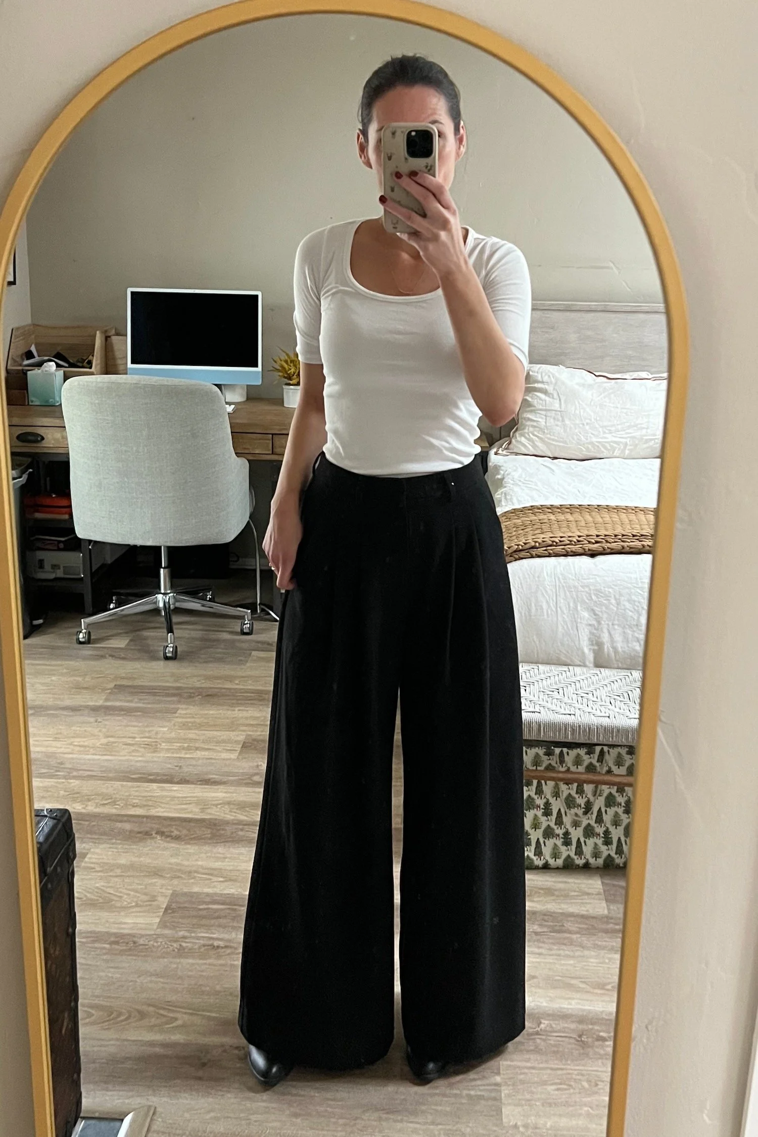Here it is on our managing editor, who is actually breaking our cardinal rule of not wearing black on the bottom with white on top. We’ll forgive her this once, but we’ll also show you our editor-in-chief wearing the inverse of this outfit below to prove black should always be on top to avoid “the waiter aesthetic.”