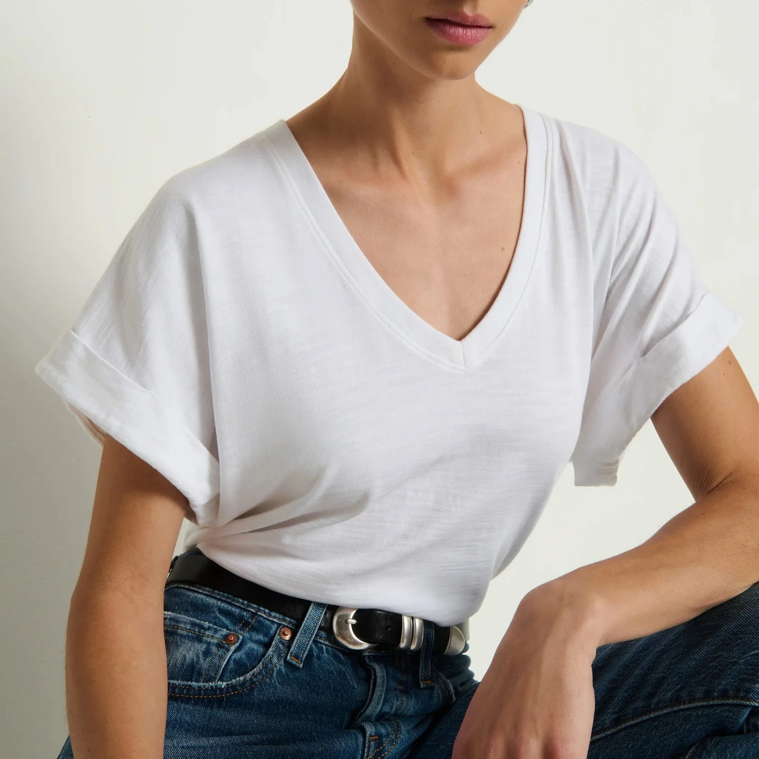 Why We Love It: Alas, we have reached the most classic, the most whispery soft, the most inexplicably flattering tee on this list. It’s not fitted but the shape feels much more like it skims and stays in place, rather than looking either clingy or baggy and adding bulk. Though it has all the necessary attributes of a perfect, white tee, it really stands out from the rest because of the length. You can wear it tucked in or out, and either way, it looks flawless.