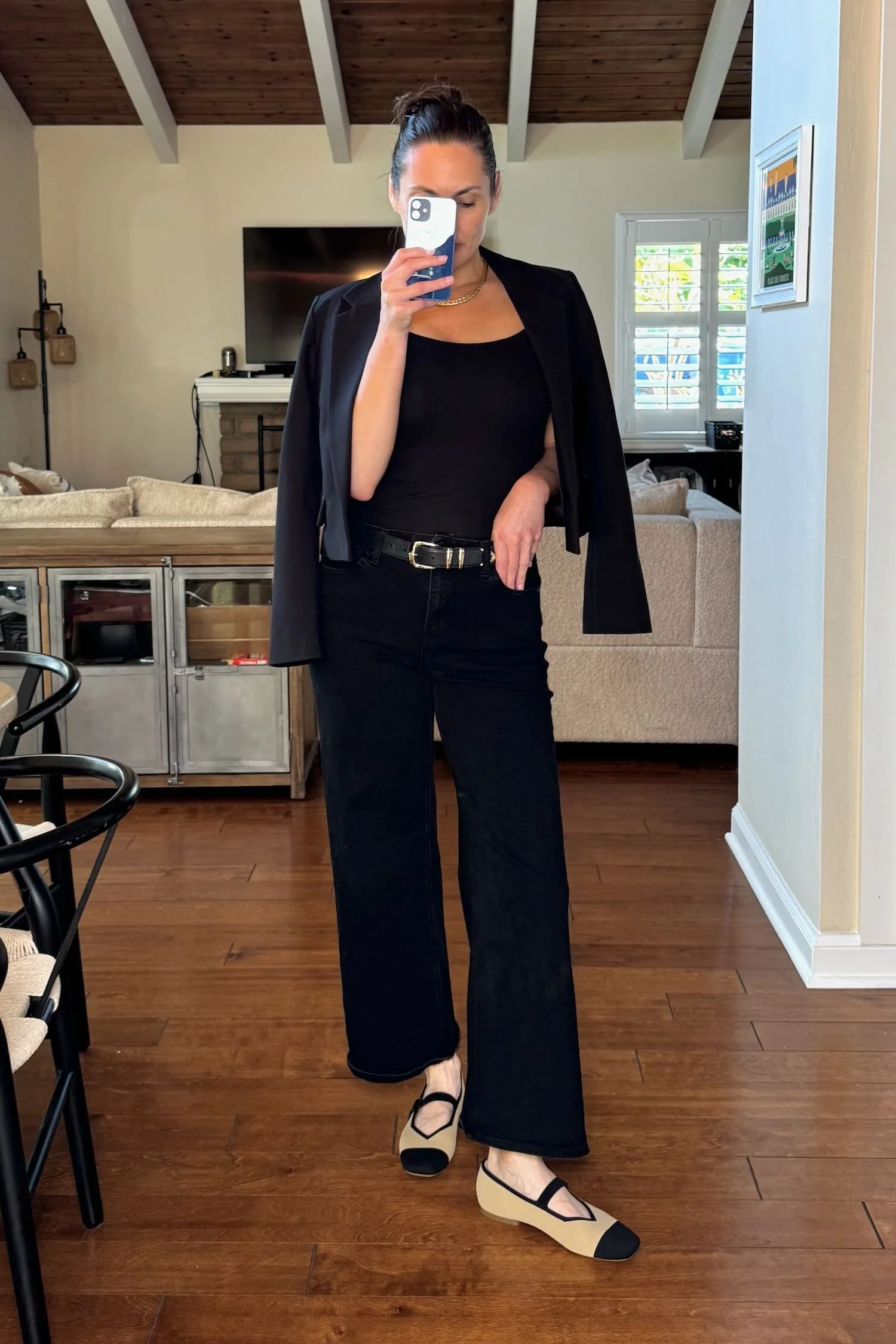 We use red to give a pop to all our neutral, “clean girl” looks such as the above plain white tee and jeans. We use the cap-toe to recreate all the gorgeous ballet flat looks of Coco Chanel, often by just adding them to an all-black outfit.