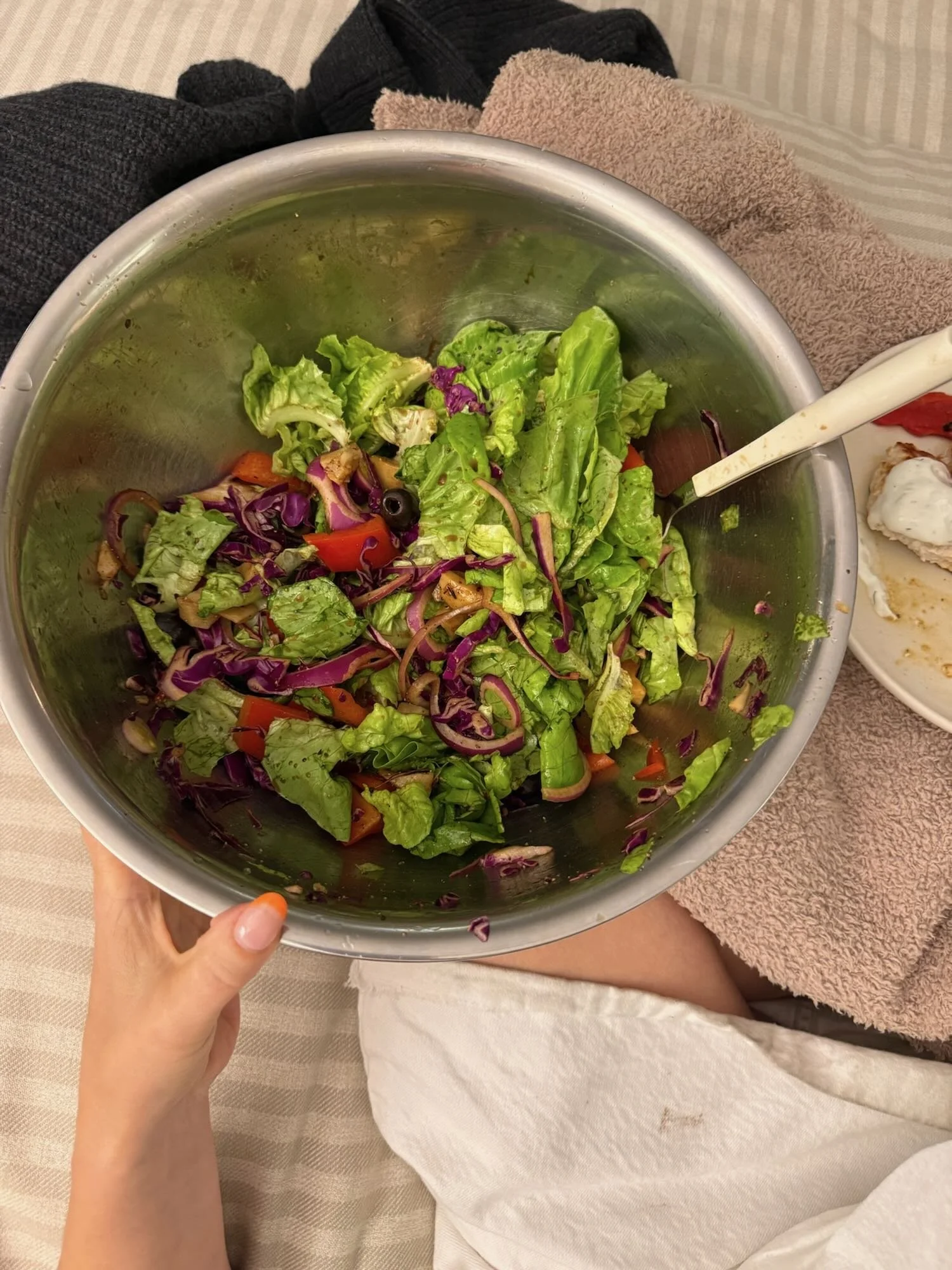Naturally, we can pretty much go wild with all the lettuces and veg we throw in there, and if the goal is to stay in a calorie deficit for the day, we can measure or be more mindful of our portions of cheese, nuts, and oils. After that, all there is to do is enjoy the long, long, crunchy process of finishing a meal that actually takes us time to finish and benefits us in so many ways, we feel we deserve a gold star just for eating it.