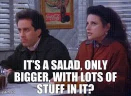 Yes, it’s just a salad. And no it’s not just a salad. It’s a "“BIG SALAD.” And that, my friends, makes all the difference to us, because unlike the teensy weensy portions of pastas, the carefully measured wraps and bowls, the half sandwiches, and the smallest slivers of dessert, we don’t have to feel like what we’re eating is gone in 18 seconds. We get to enjoy bite after bite, a long, languishing lunch that gives us time to get full instead of just feeling sad that the meal is over and scanning our options for an after-lunch snack.