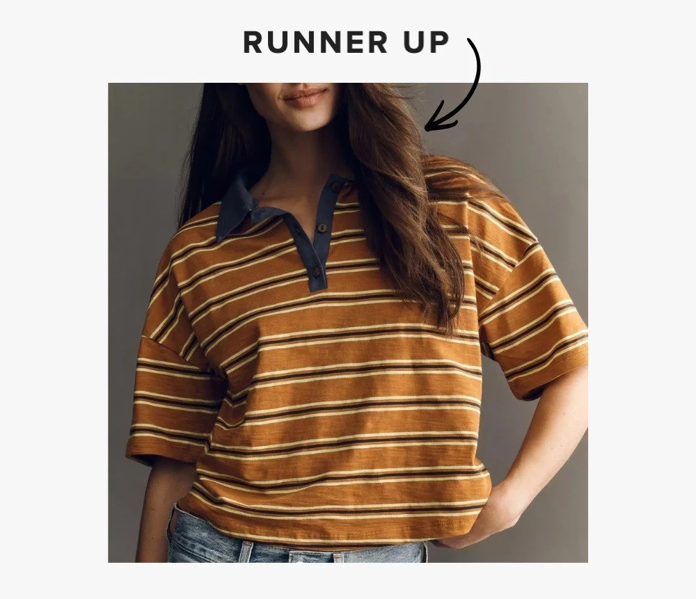 Why we love it: As women over 35, we’ve been falsely taught to fear the word “cropped” when, in fact, a higher cut top actually makes our waists look smaller. It hits right at top of your pants, so you never have to fuss over tucking in your shirt to look styled. This one comes in thick stripes, thin stripes, and every color combination you could want.