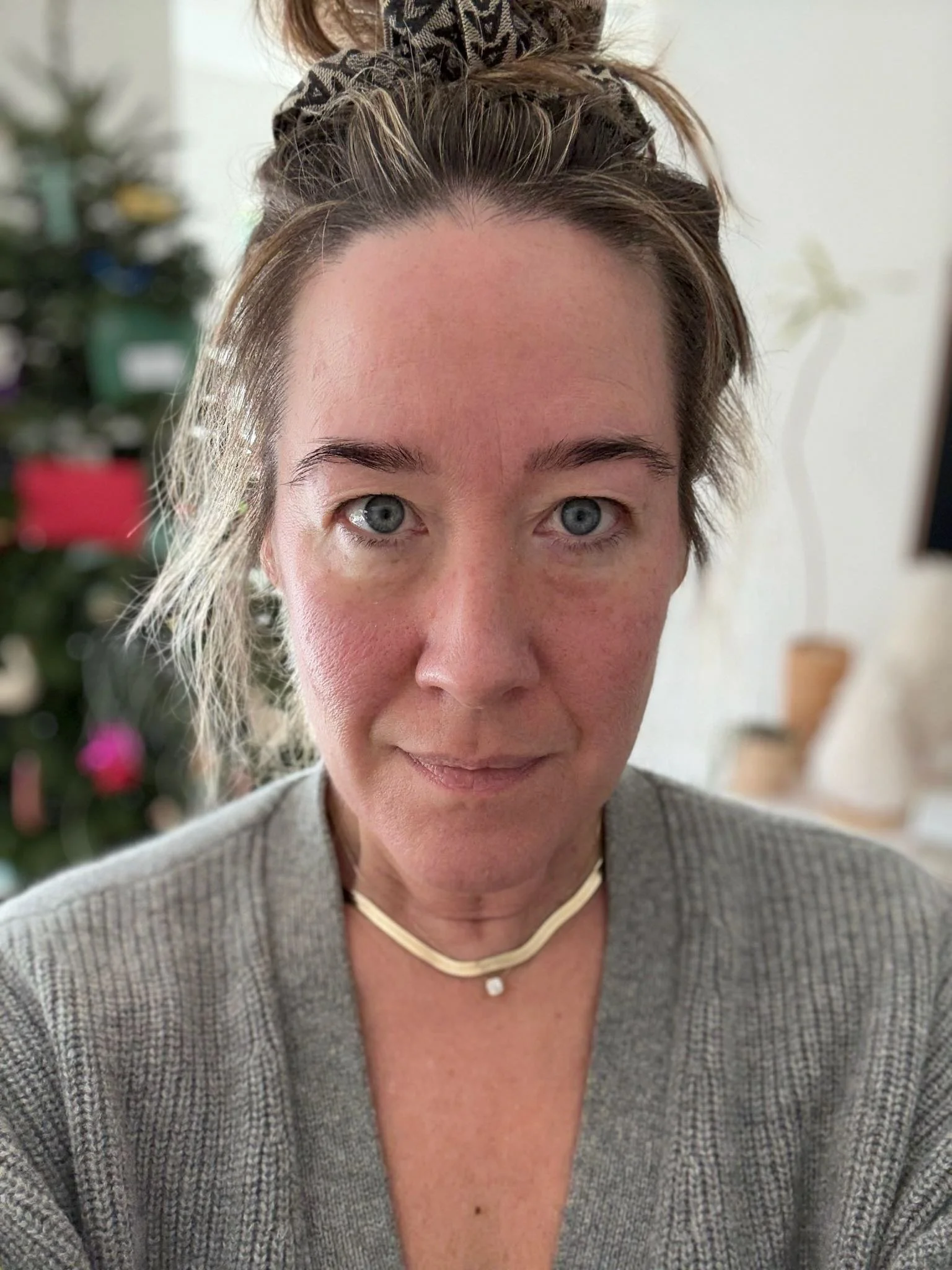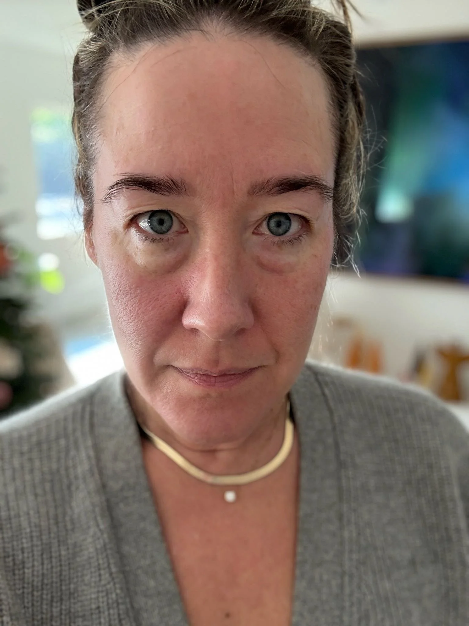 If you try it, use a tiny amount, only on the bag itself. Nothing on your inner corner, and don’t drag it out to the crows feet area of your eye—it sort of feels like an eye cream so you’ll be tempted. But just place it straight on the bag to minimize crusty potential. I did my whole skincare routine first, then used the product, and then pressed a tiny bit of eye cream onto it once it was dry so my eyes didn’t look crinkly. We don’t want to swap bags for wrinks now do we? But here’s a shot of me head on so you can see for yourself:
