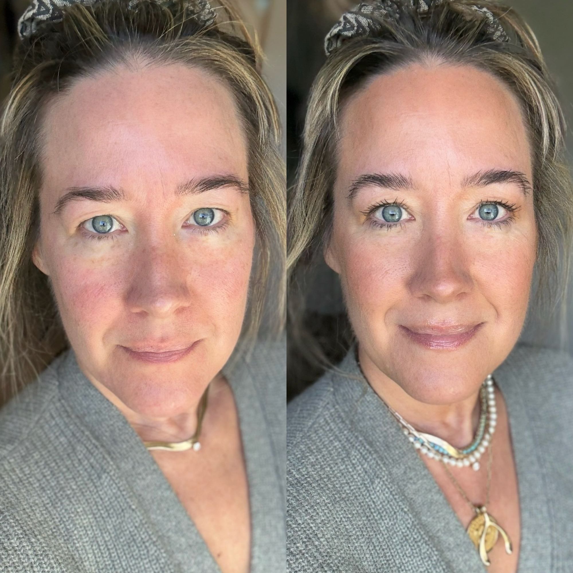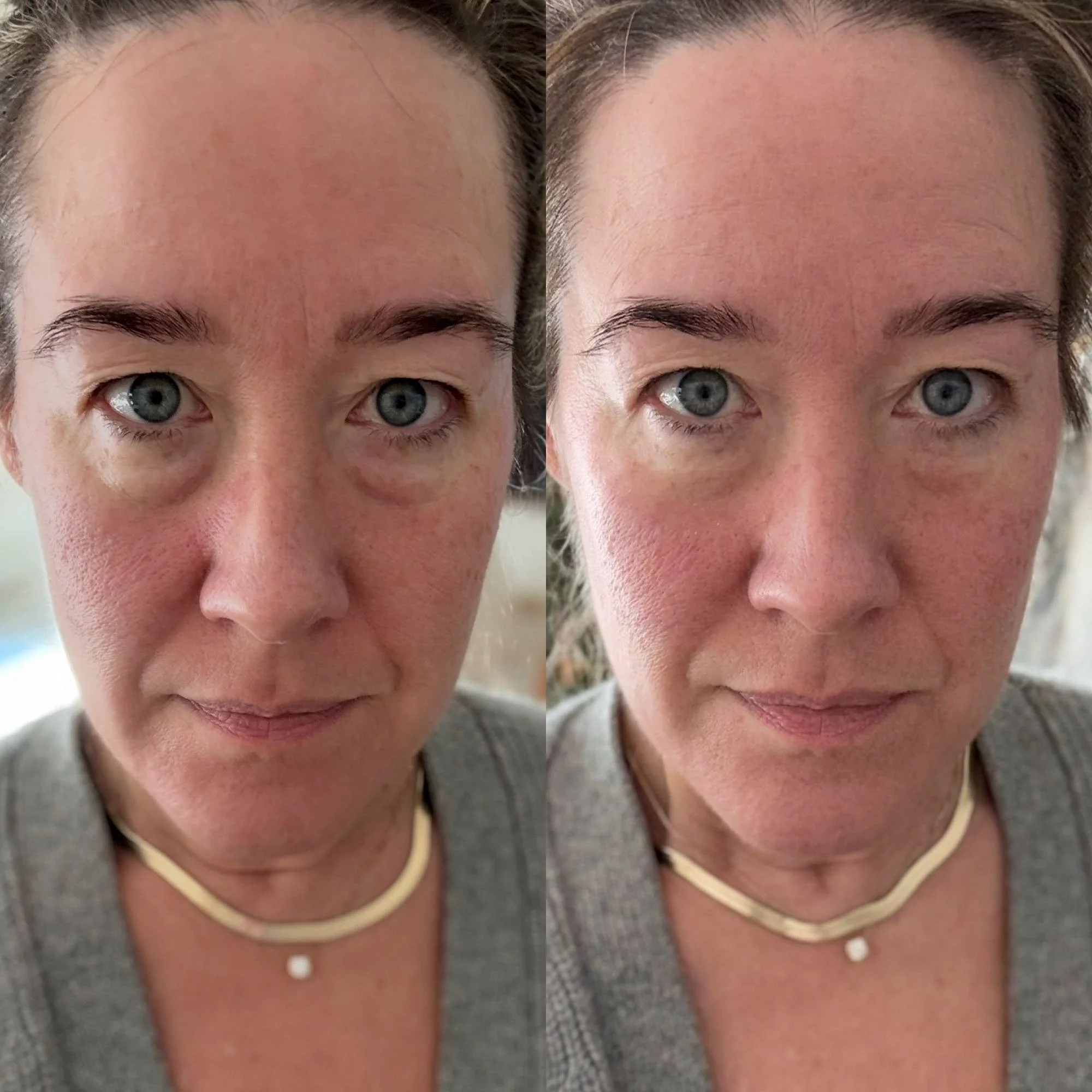 I’ve tried these types of products before, and usually my main complaint is that they’re so flaky and weird, you can’t wear makeup over them. So? I put on a full face of makeup to see how things hold up. On the left is me in better lighting with the product on (in good lighting the bags are truly almost gone!), and on the right is with makeup layered over the product: