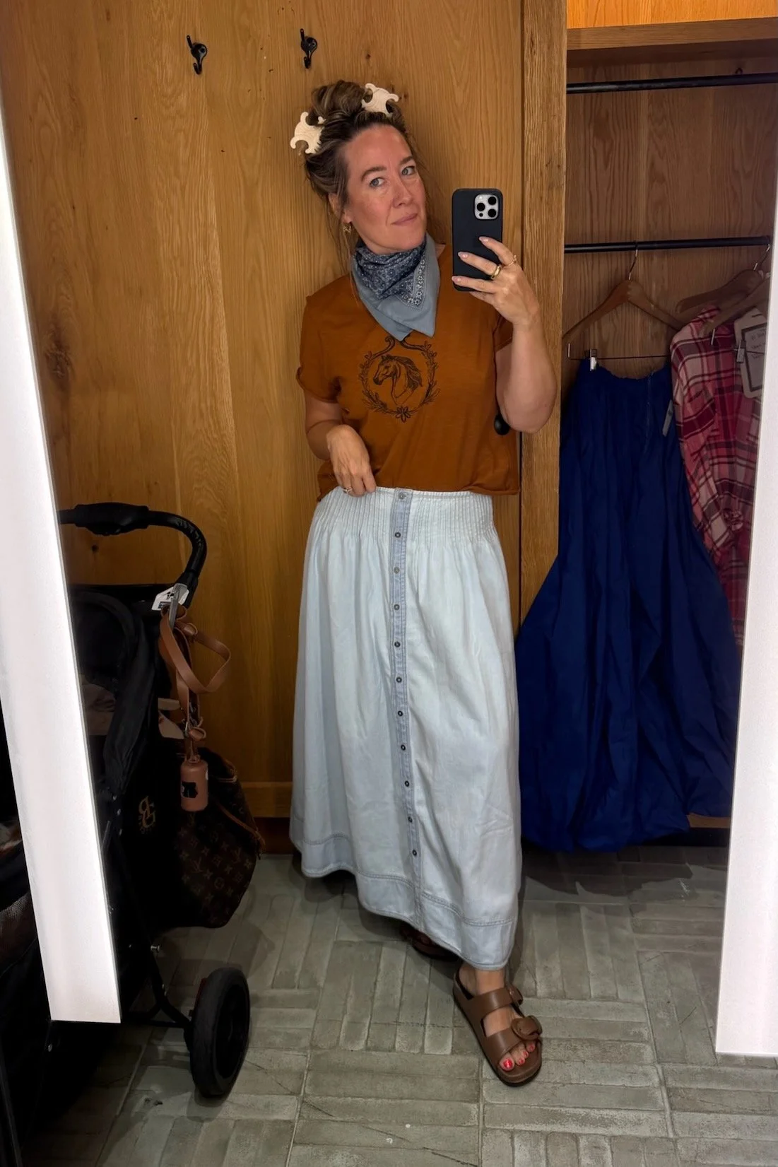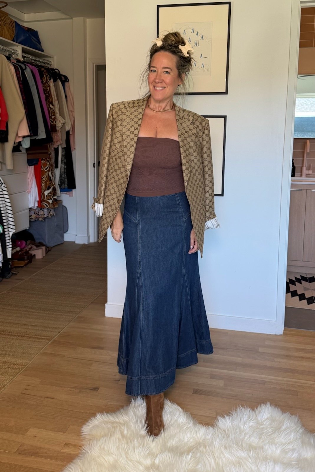 Oh look. Another denim skirt! Something to note is that we will often see skirts described as “midi” but once they are on us non-gigantically tall women (I’m 5’6” for ref) they are actually maxis! I will say this skirt’s shape is great if you’re an hourglass but if you’re more appley THIS* one is supremely flattering. Also don’t come at me about the jacket—it’s second hand. (Still saved up for it.)