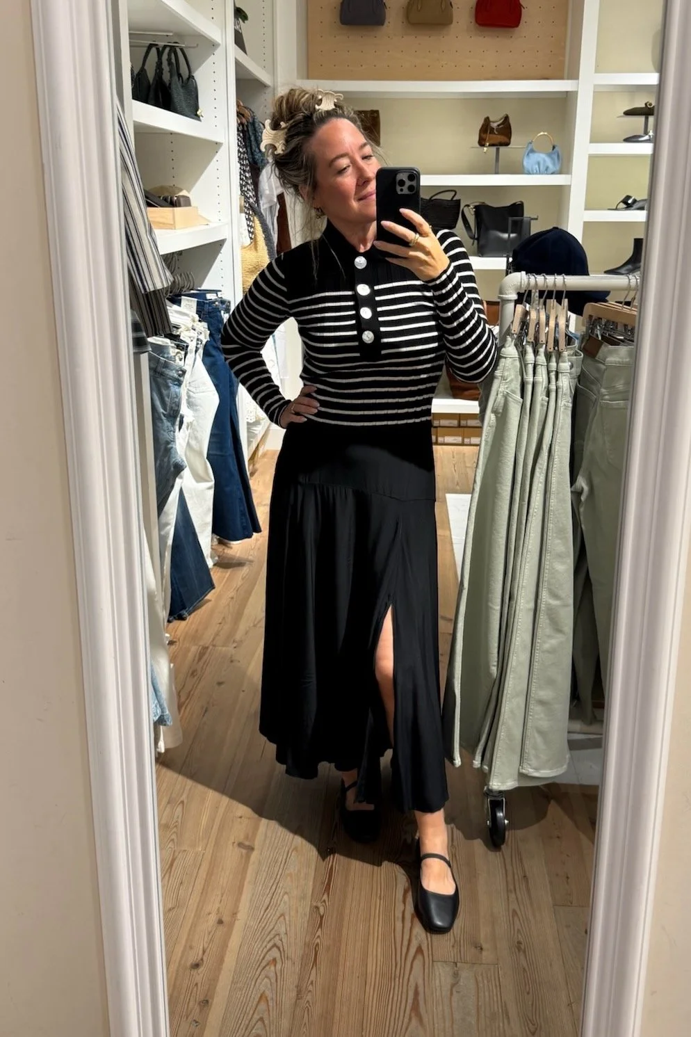 If you promise me you’ll wear a stripe or a neutral like a grey, or better yet, you’ll wear black on top (because nothing is chicer than all black) then I must inform you that this black skirt is absolutely gorgeous. It’s that silky crepe material that looks sharp but is totally machine washable and low maintenance. And the slit! I bought it immediately. I might go back for the flats which are close to the most comfortable shoes I’ve ever worn in my life.