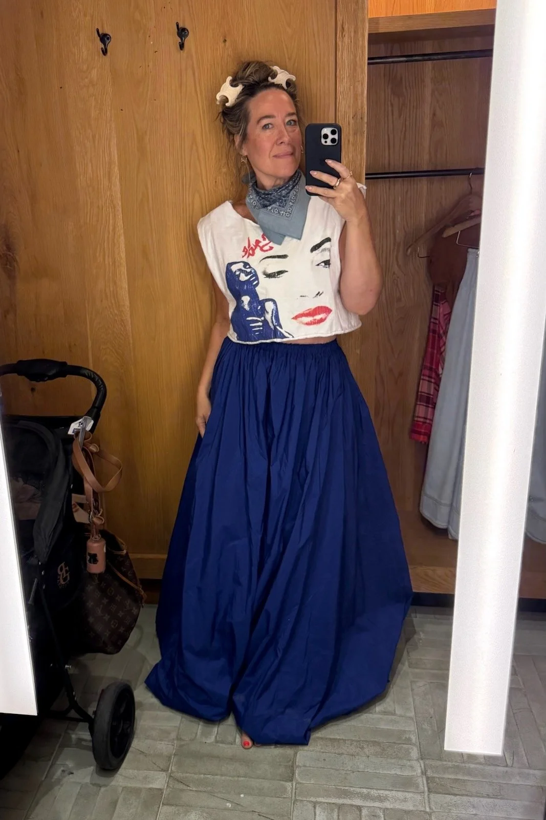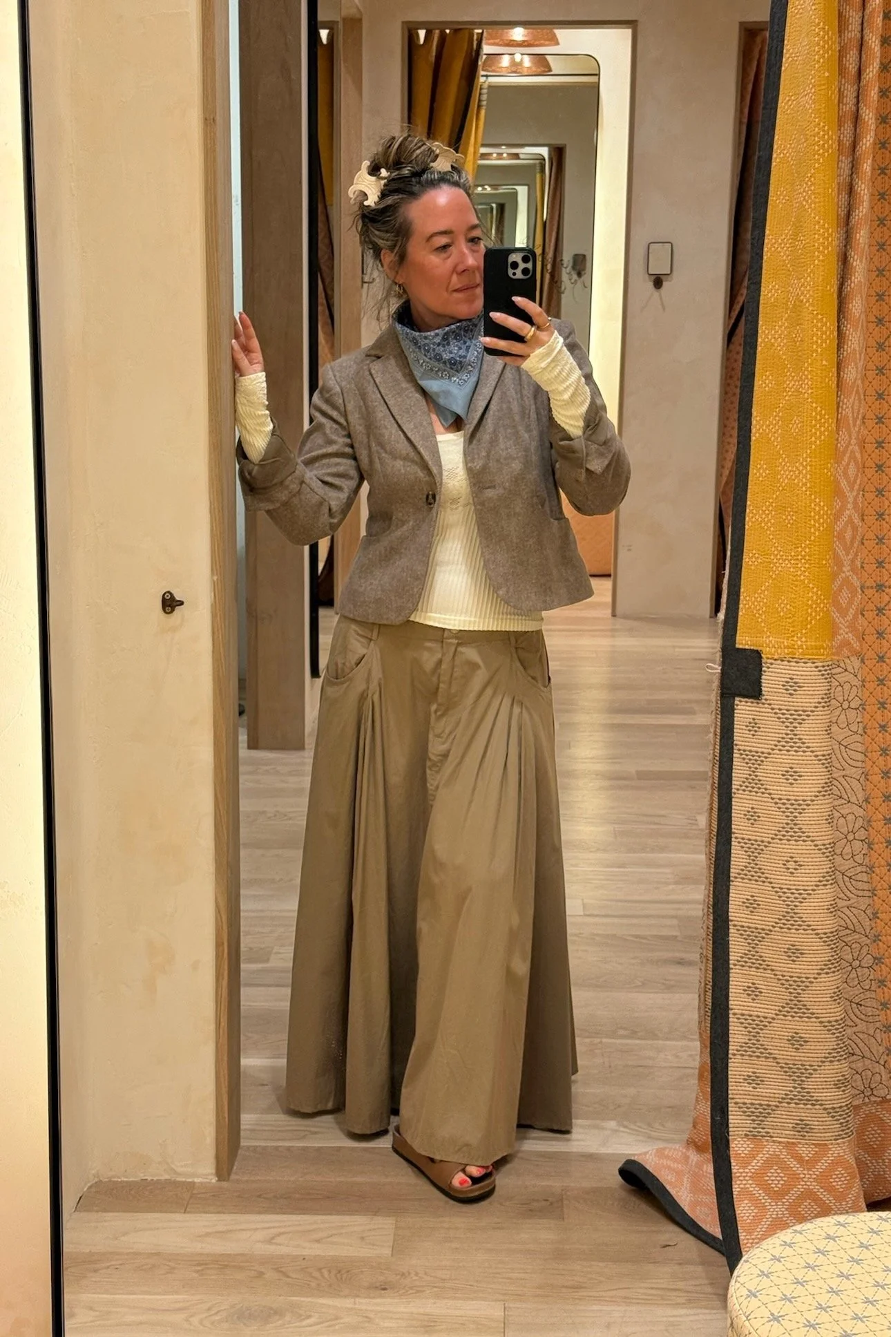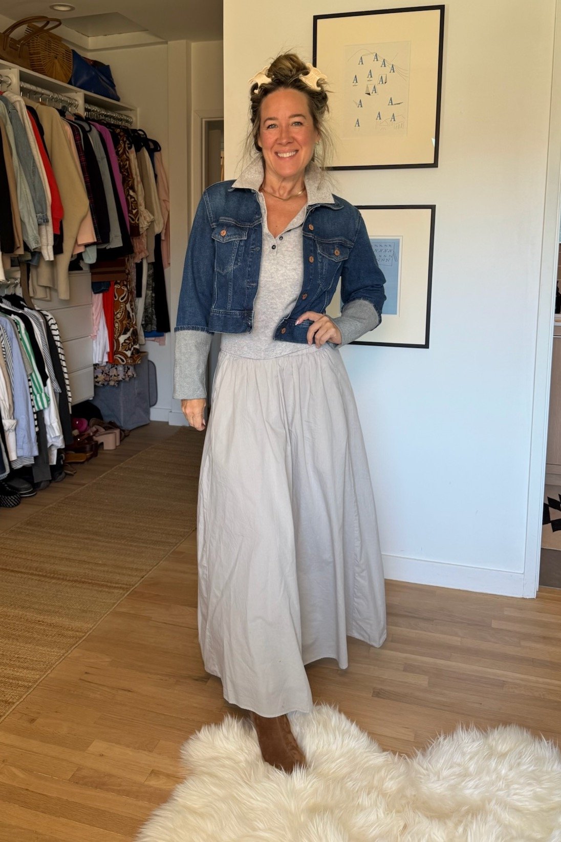 Another true maxi! Don’t I look like I should be teaching philosophy on a crisp fall day in a cozy northeastern college? Perhaps I will someday. But in the meantime, I will be buying this perfect, khaki-ish skirt that I cannot wait to wear with knee-high socks and a riding boot. And ps, it runs very large. Also look* at the back—it’s sort of pleated in this very flattering way. I know you think Free People is for festival goers and Gen Zers, but I promise, it’s also for us.