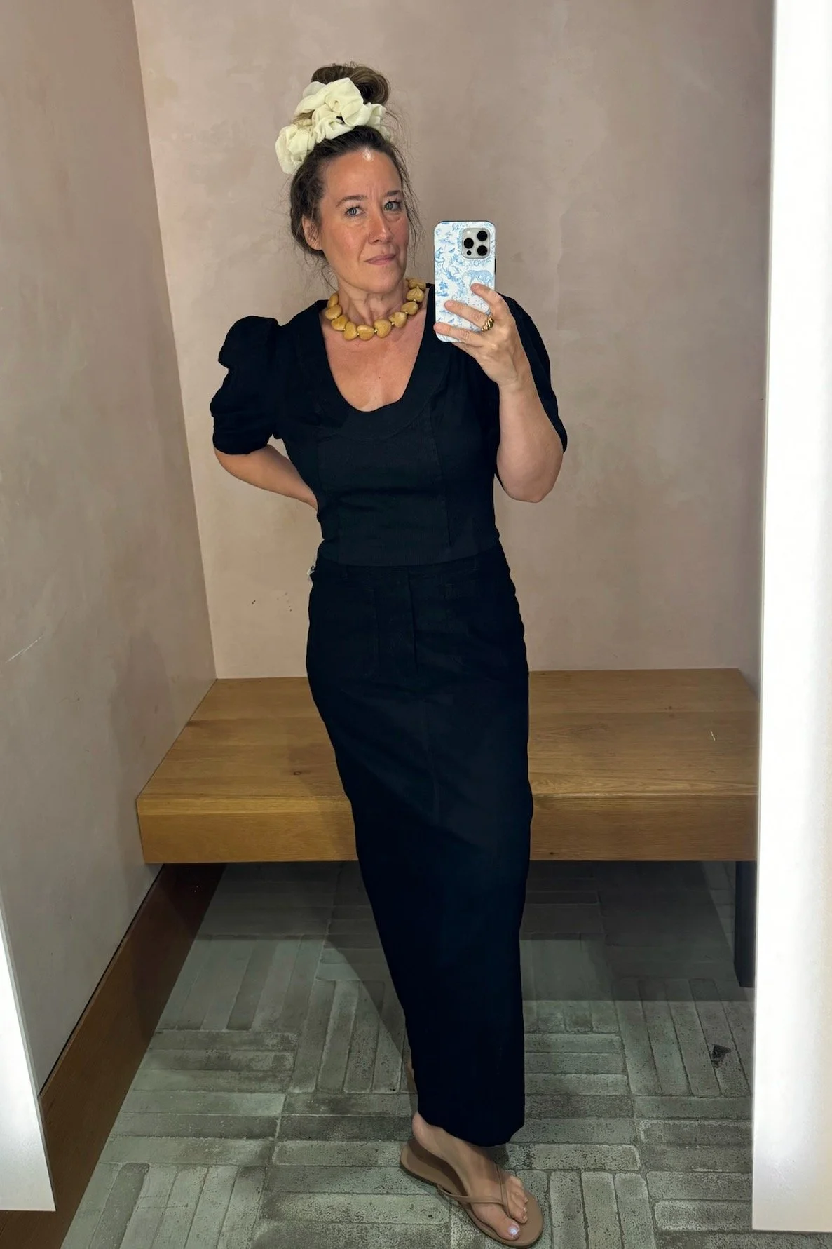 At last, the column skirt - a shape that’s highly underrated in terms of being supremely wearable and very flattering on a belly pooch and bootie. Plus, it gives you endless length, so you look longer and more lythe. It’s hard to completely see in the black, though God the lighting in Anthro dressing rooms is good, isn’t it? That said, I actually prefer it in white with black on top (the chicest of all color combinations). The exact black top I’m wearing is out of stock, but THIS one* is very similar.