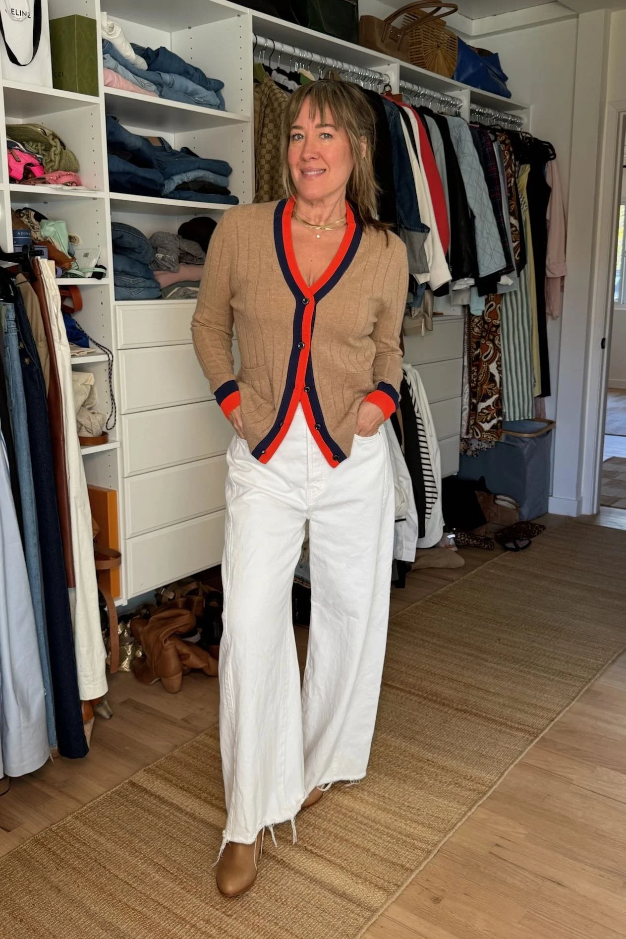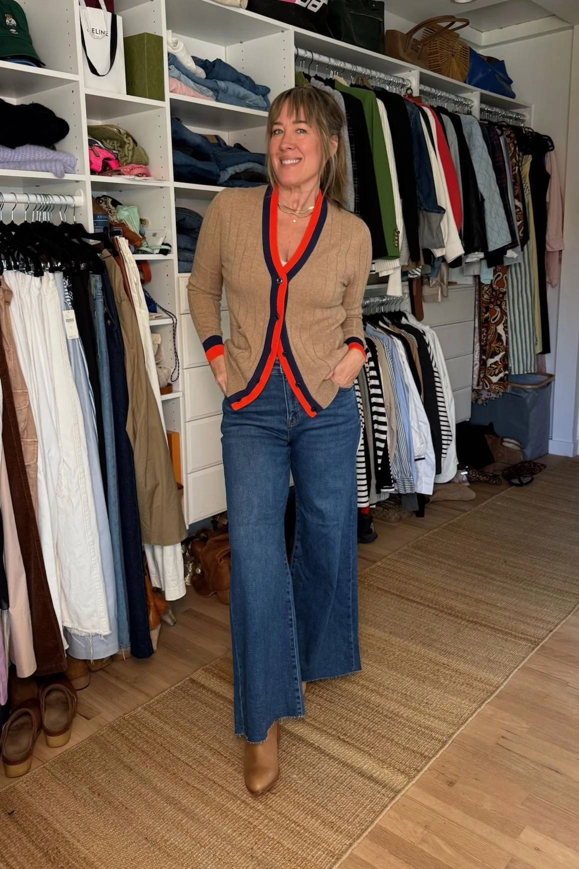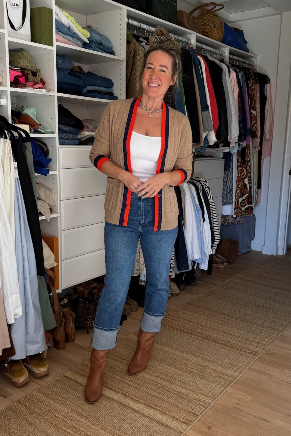 It’s 100% ribbed cashmere, blessedly has pockets, the fit is so wildly flattering, and we like wearing it both open with a tank and fully buttoned as almost a sweatershirt hybrid—one of our little tricks for looking extra chic. The position of those stripes is just beyond, isn’t it? Also just stripes in general are always a yes. Are you seeing why this sweater danced in our minds for over two years?
