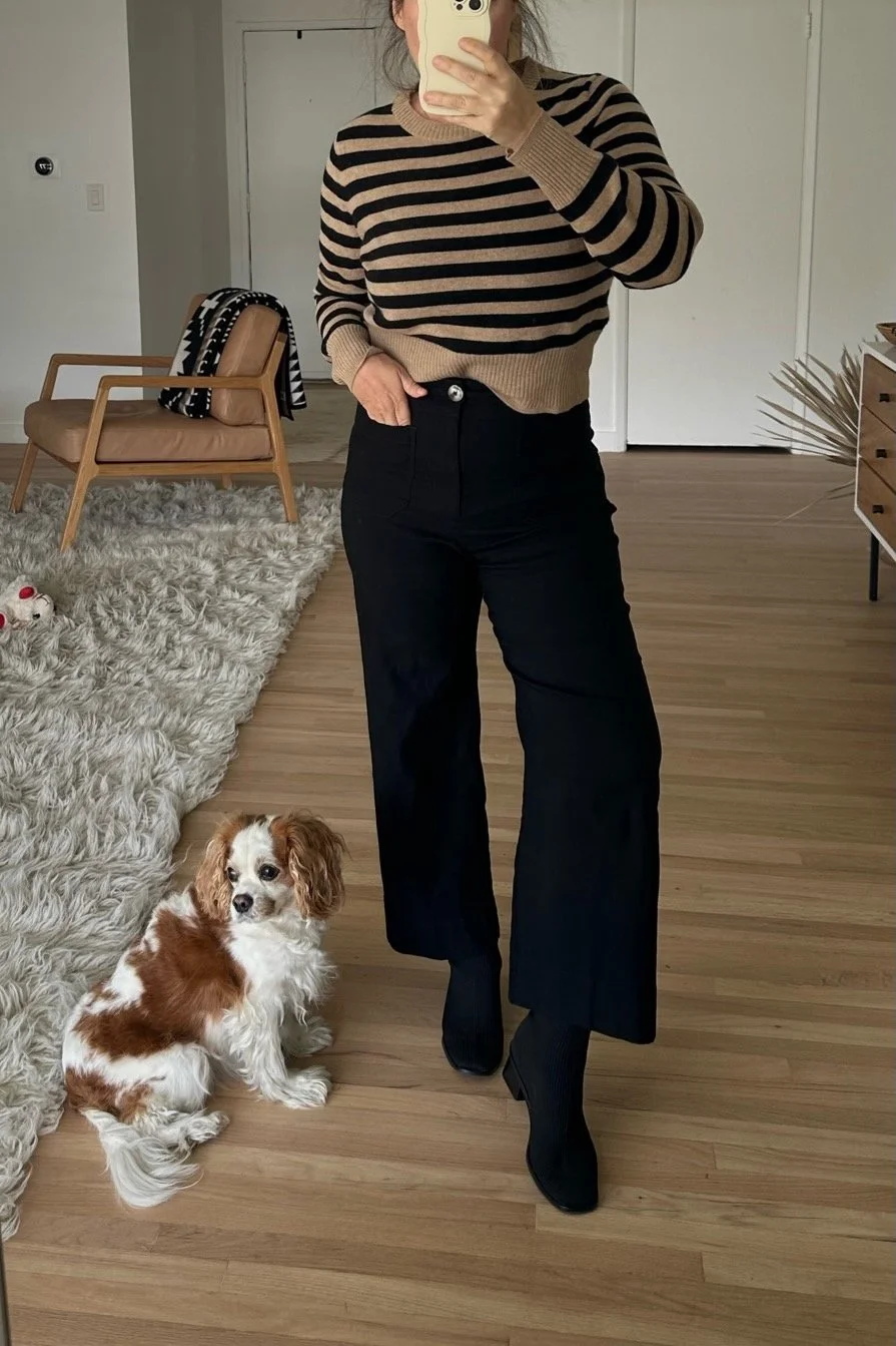 This is the part where we bore you by telling you how much fit matters when it comes to feeling our most confident in clothes. But this sweater is ALL about fit. See how the waist goes in but the elastic is long and wide? Well that does wonders for making our waists look nipped. And it hits at the most flattering spot right at the top of our pants, so for those of us who don’t like to fuss over a tuck, this is the dream sweater.