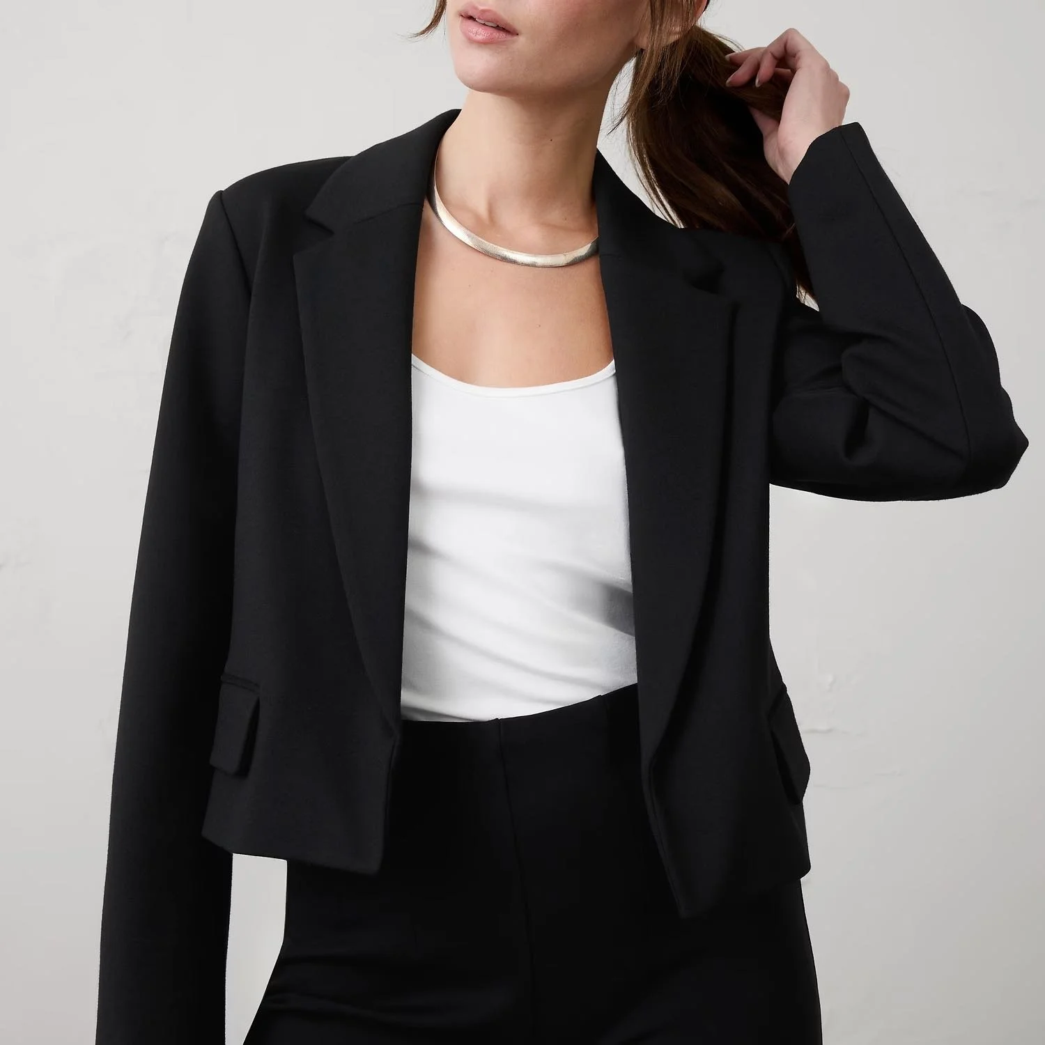 A blazer with this more cropped cut is the perfect thing to drape over a slinky dress. It doesn’t totally swallow us or take away from the clean lines, but we still get that itty bit of extra coverage that’s nice to have on hand.