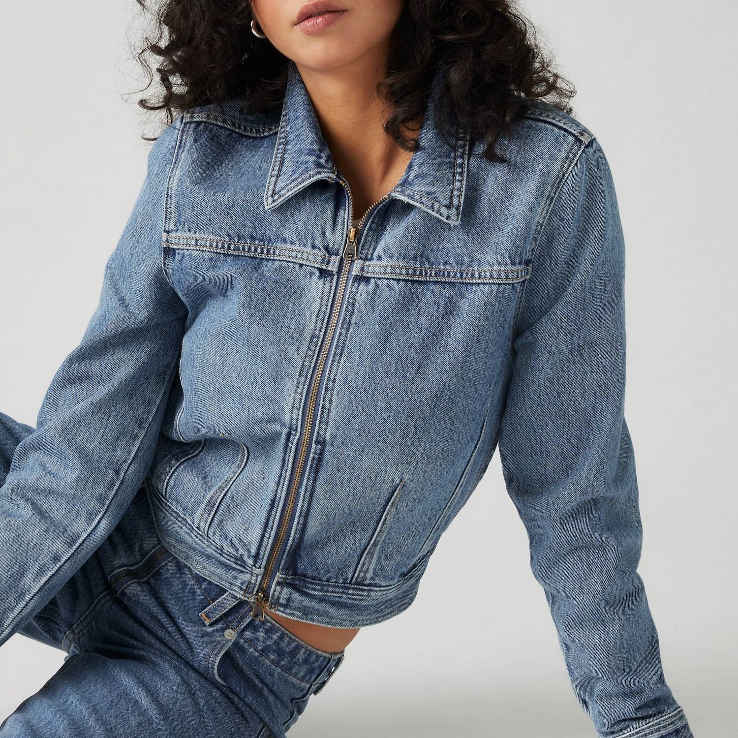 You know all those times where you want to look dressed up enough to show up anywhere looking amazing but also look cool and casual and like you didn’t try too hard? Well this outfit felt like a solution to that feeling. The mix of a jean jacket with leather pants and sneaks is just so, so smart. And the shape of her jean jacket won us over immediately. Luckily, we found an incredibly similar version.