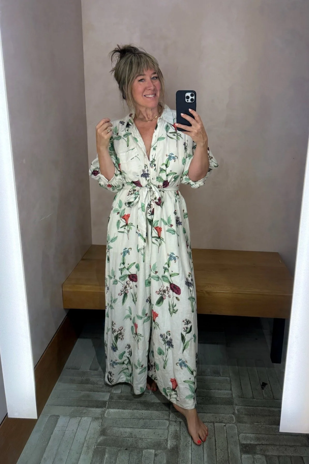 This pattern is divisive, we get it. We actually feel like it’s curtain-chic, but it also comes in black and sort of a flax if you’re more classic. We were wearing a medium in the photo above and it ran very large and it was the only size in the store so it’s a hair too blousy, but the concept of wearing more of a dressy set rather than a dress is a lovely choice.